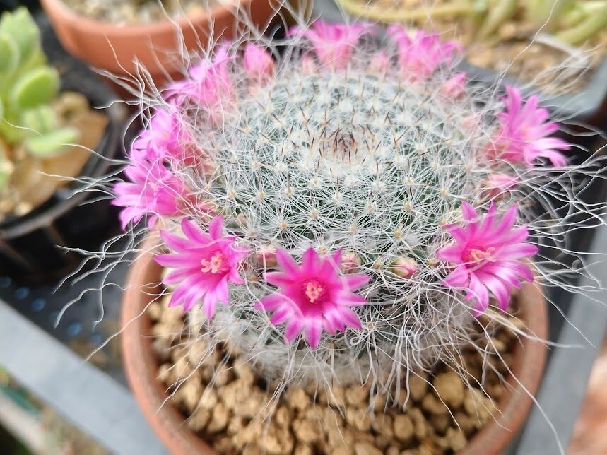 ハウスの中とウミウを載せますねサボテンの花 親の種から育てたサボテンに花が咲きました