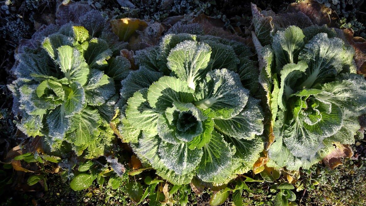 浸水被害に遭った白菜にも霜が