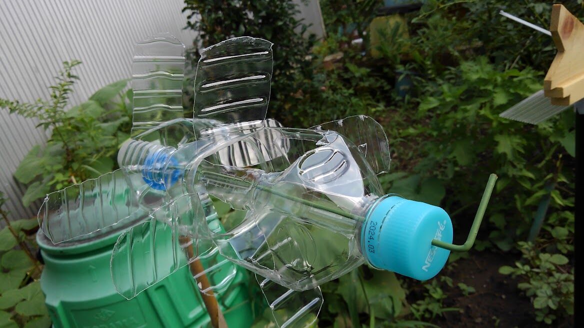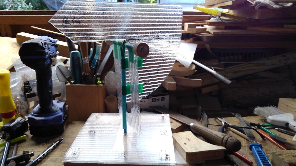 結構振動があるのでモグラ除けに効果あるかなと木製の風車 羽根の部分をポリカーボネート板で