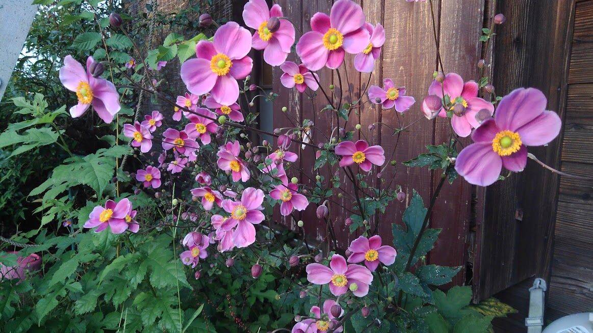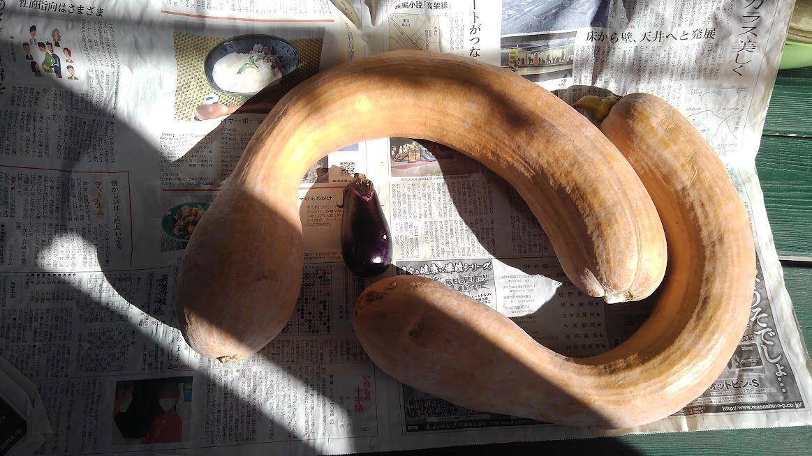毎年同じくらい咲いてます母屋の前のシュウメイギク 刈り取らなかったので多いですパンパグラス 今年は穂が少ないですスープカボチャ頂きました ナスと比べるとだいぶ大きいです