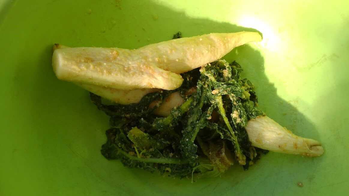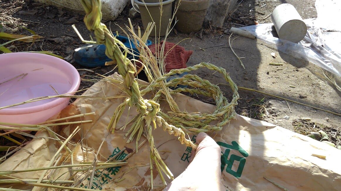 北風が当たらない場所で年末恒例のしめ縄作りなどを