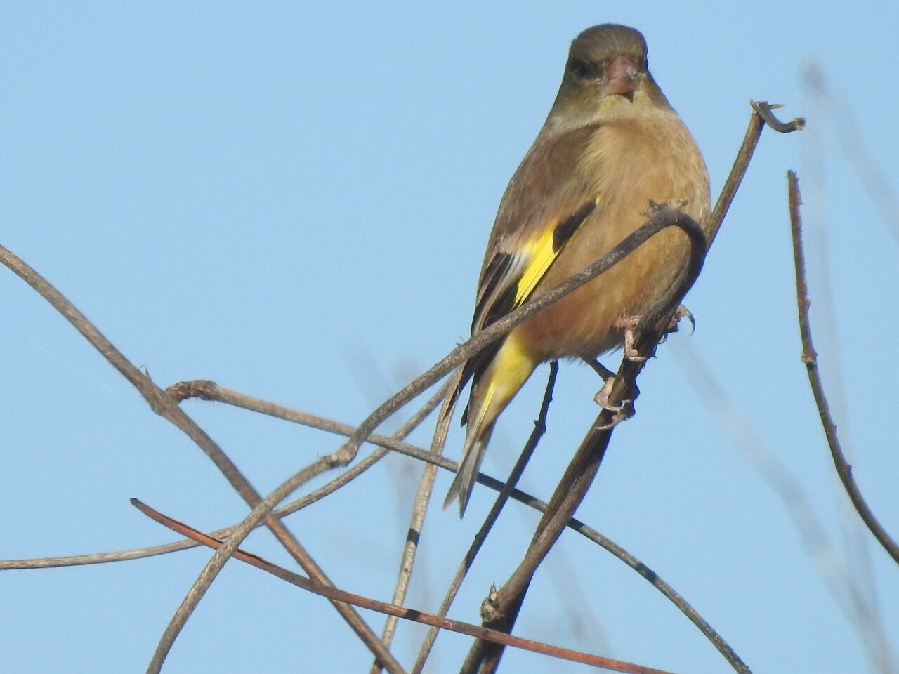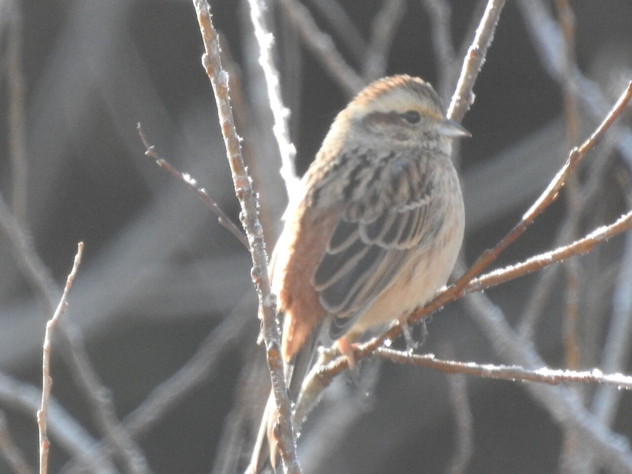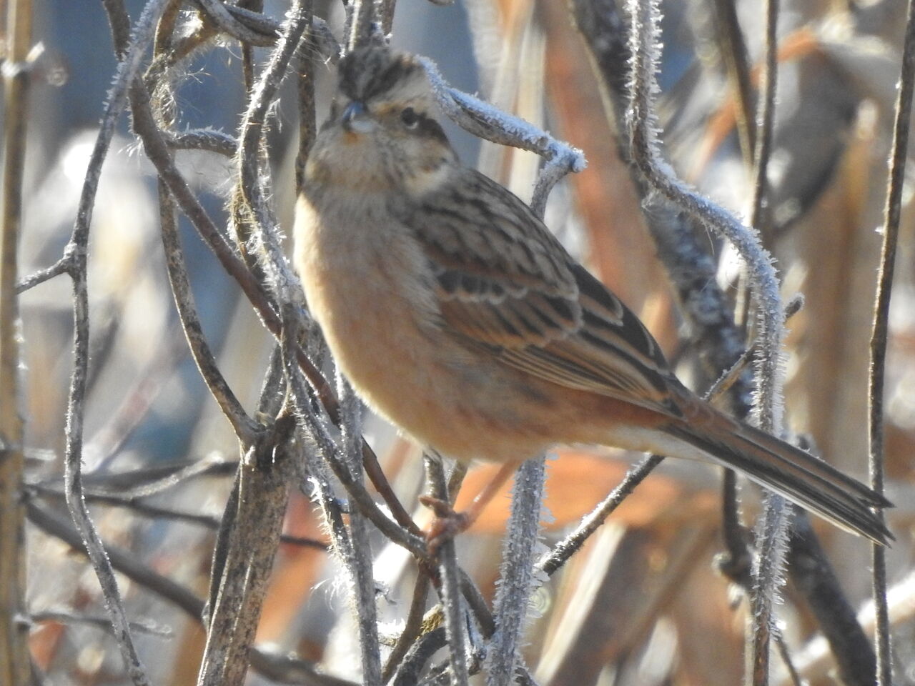 おちおち食べても居られないですホオジロのメスかな ビッシリと霜が降りてます逆光で 散策コースでは東に向かって歩いてるので