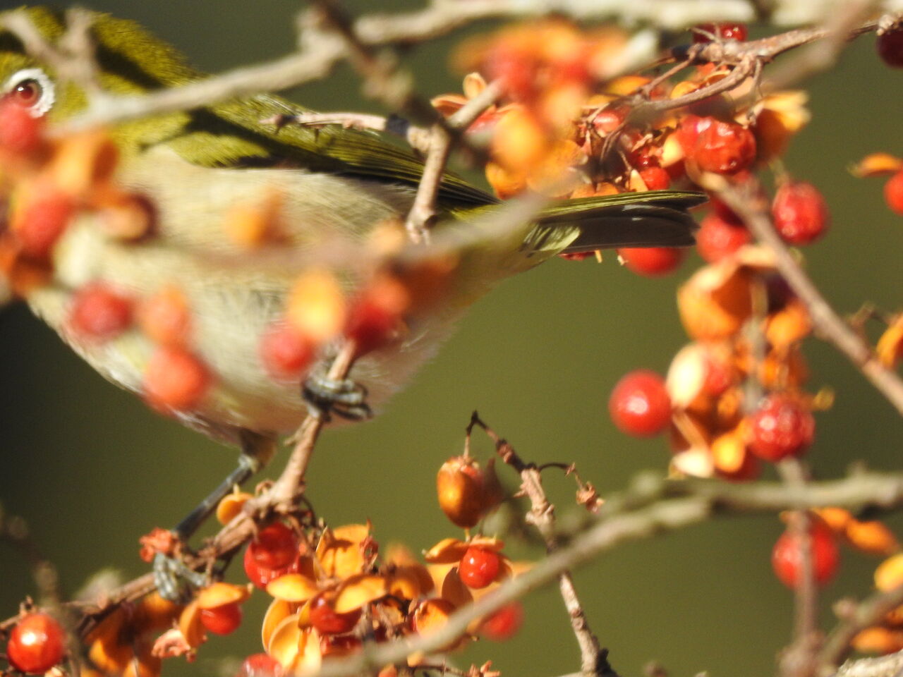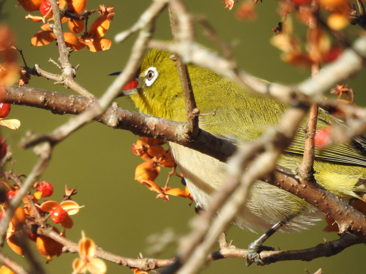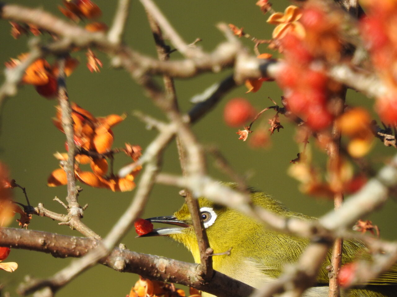 これからはマラソンですね 相撲はいまいちだしメジロがツルウメモドキの実を咥えてますヒヨドリぐらいしか食べないと思ってたけどすぐにヒヨドリが邪魔しに来るので