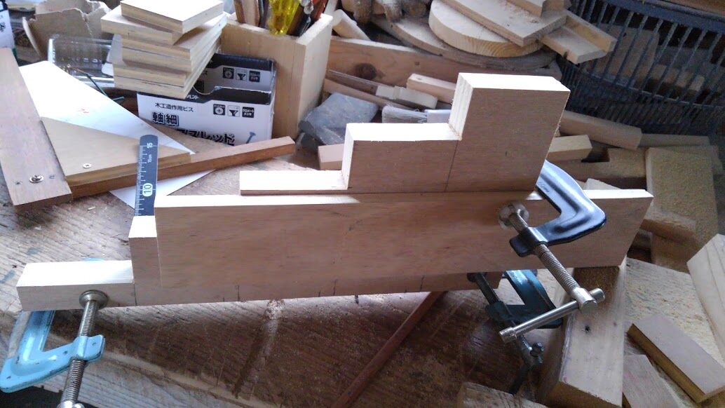 手前の幅の狭い板を鋸のガイドラインにして