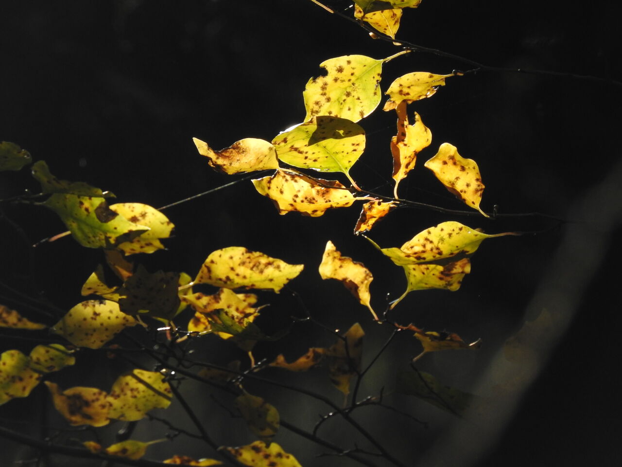 一枚目の黄葉した葉が、なんだか透けて、影絵のように見えますね。