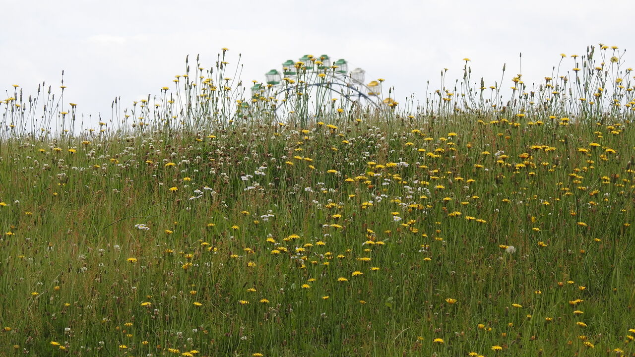 サイクリングロードからみた観覧車花の名前分からないけど たくさんのカメラマンがいました目立った花無いのでアザミでも
