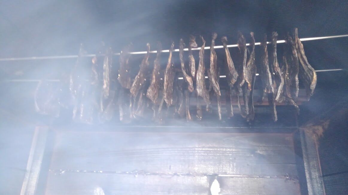 三日風通しの良い日陰で干しておき 正に干し肉朝9時から40度をキープするように燻煙
