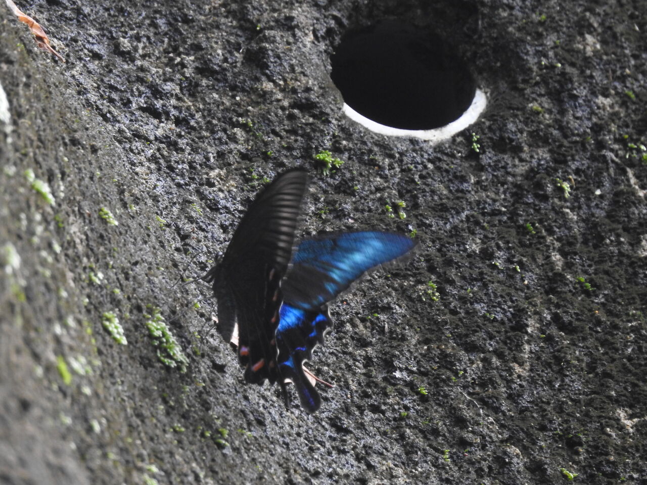 コンクリートの法面に来たカラスアゲハ♂は塩分やミネラルを含んだ水を吸っているのでしょうか。