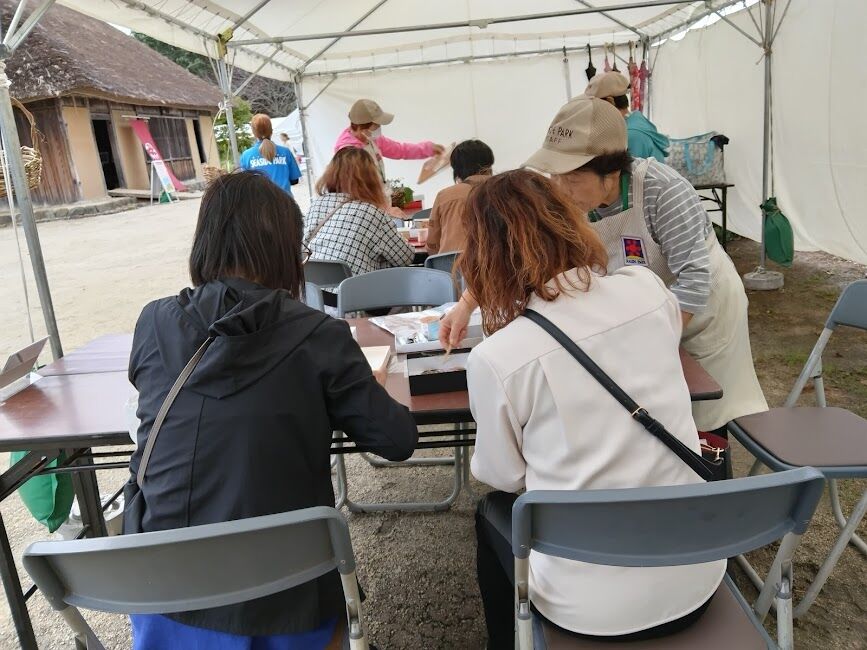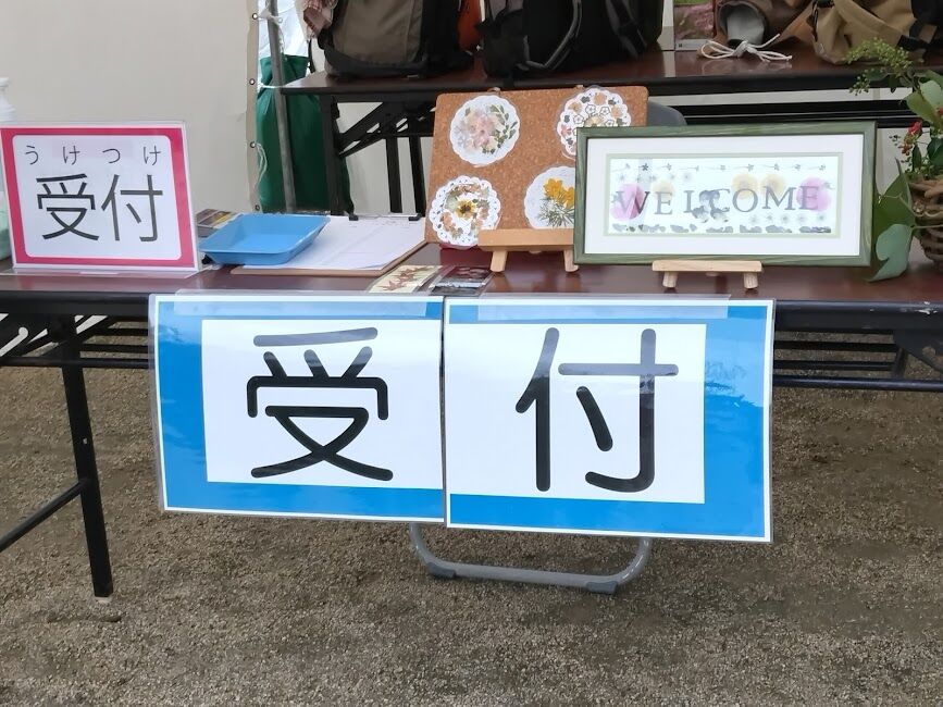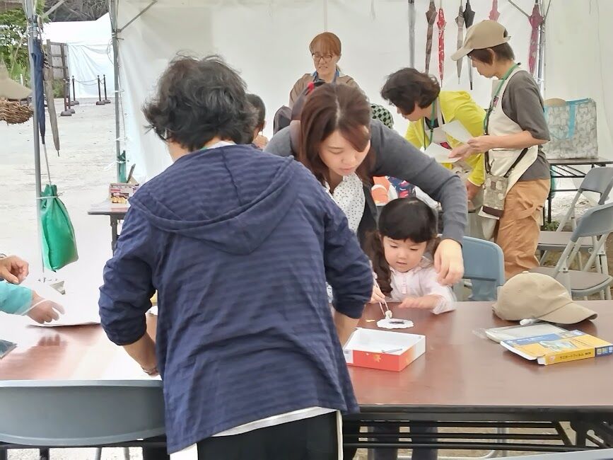 僕らのテントはこの左側にありますまずはこの受付でしおりやコースターなど どれを作るかそれぞれ想い想いに作ってまらいます p仲間が丁寧にアドバイス意外と小さなお子さんの方が面白いのを作ります