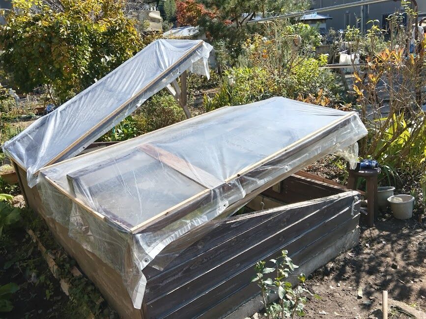 散策二回山と川 それで全然野鳥とは出会えずミニバラにうっすらと霜が霜と夜露が凍って 正に冬の風物詩そんな中キキョウは元気に咲いてましたフレームの屋根 残りの一枚を張り替えて