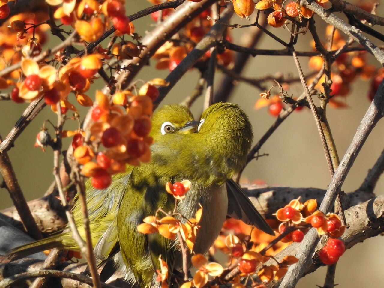 元日の午前中の恒例になってます初日の出を待ってるスズメちゃん家に帰ってくるとツルウメモドキにメジロのカップルが
