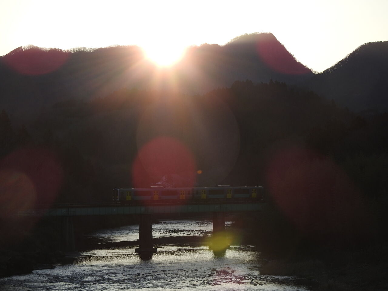 右側の高い山が奥久慈男体山です日の出直後に水戸行きの列車が