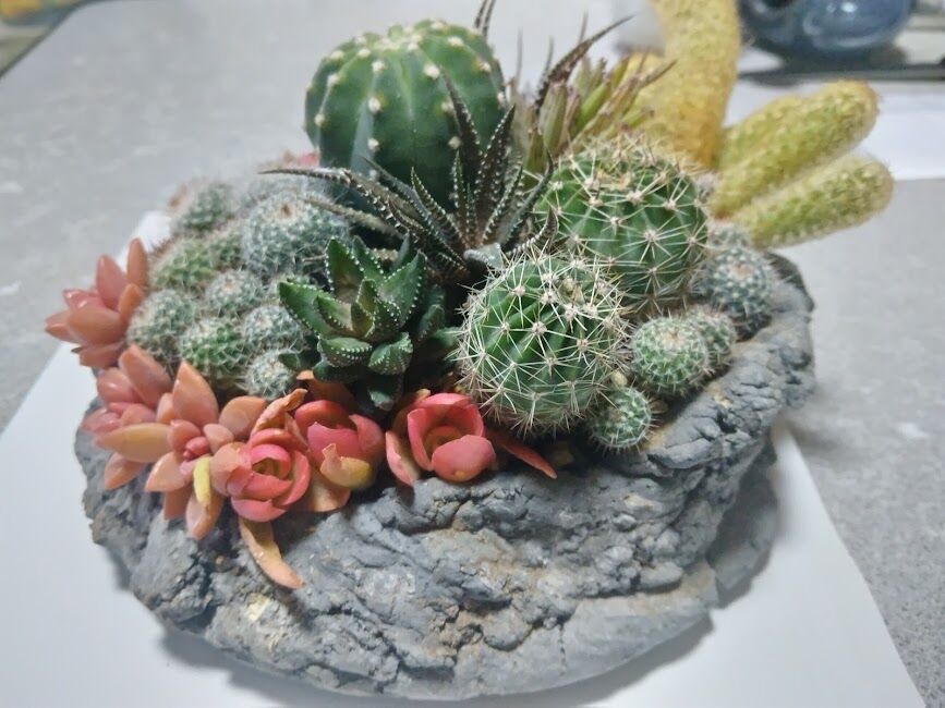 奥様の手作りの植木鉢にサボテンと多肉の寄せ植えがバッチリで、お見事です。
