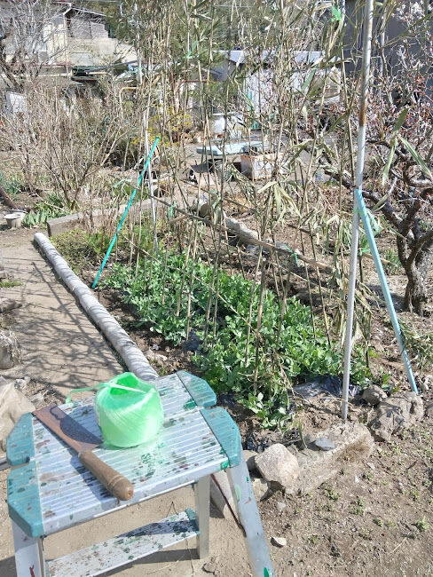 こちらエンドウ、白い花が咲き出しました。ヒヨドリに食べられなくて良い感じに成長しています。さやえんどうとスナップエンドウ蒔いたので、楽しみです。