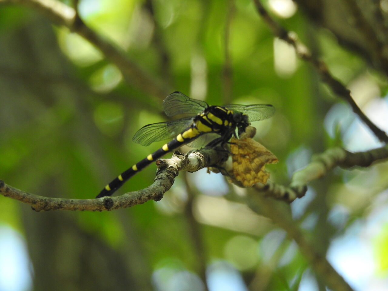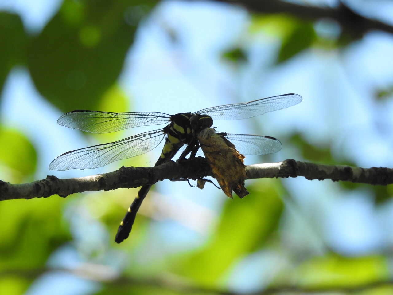 散策から帰ってきたら 目の前にチョウを咥えたコオニヤンマがコオニヤンマが目の前の桜の枝に止まり