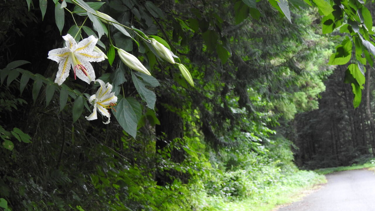 散歩コースの林道はヤマユリが満開で気持ち良さそう。