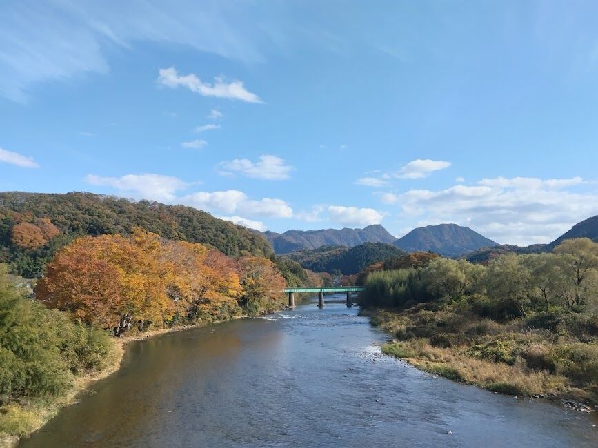 久慈川とケヤキの黄葉は、青空が素敵で遠近感もあり、とても綺麗な風景ですね。ナイスショットです。