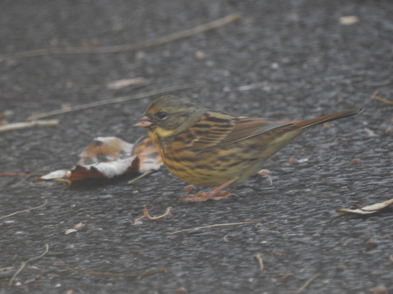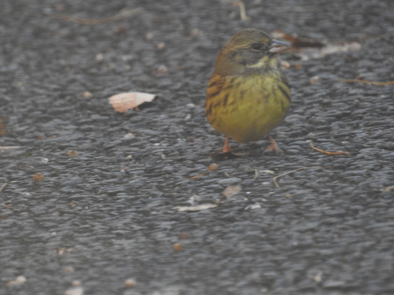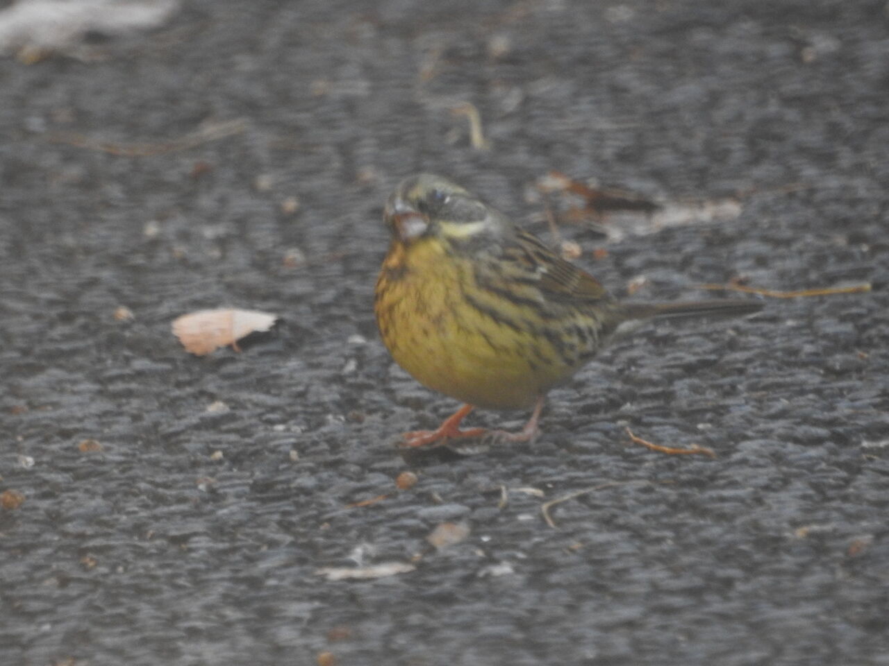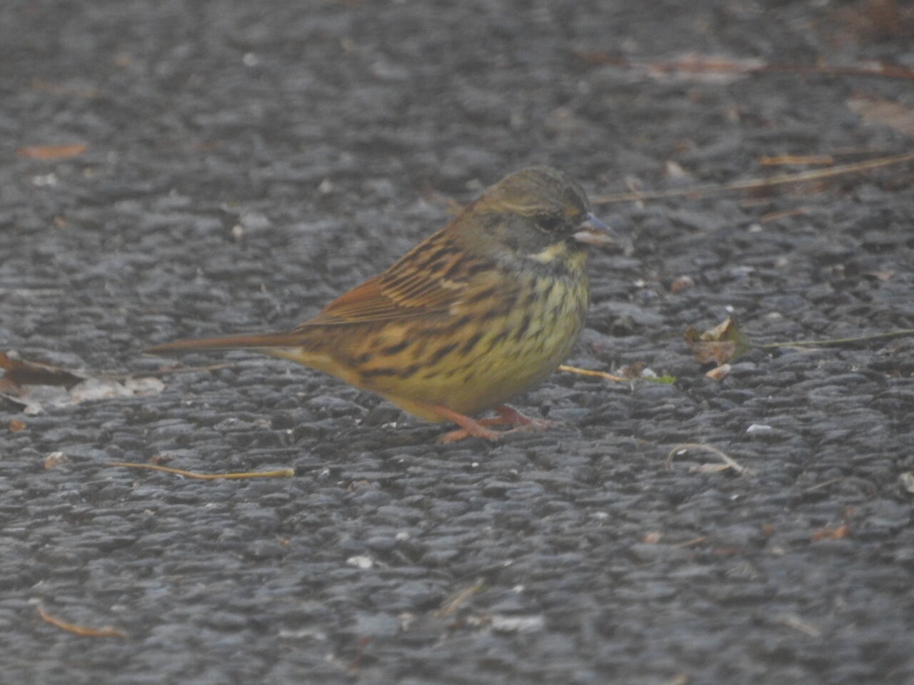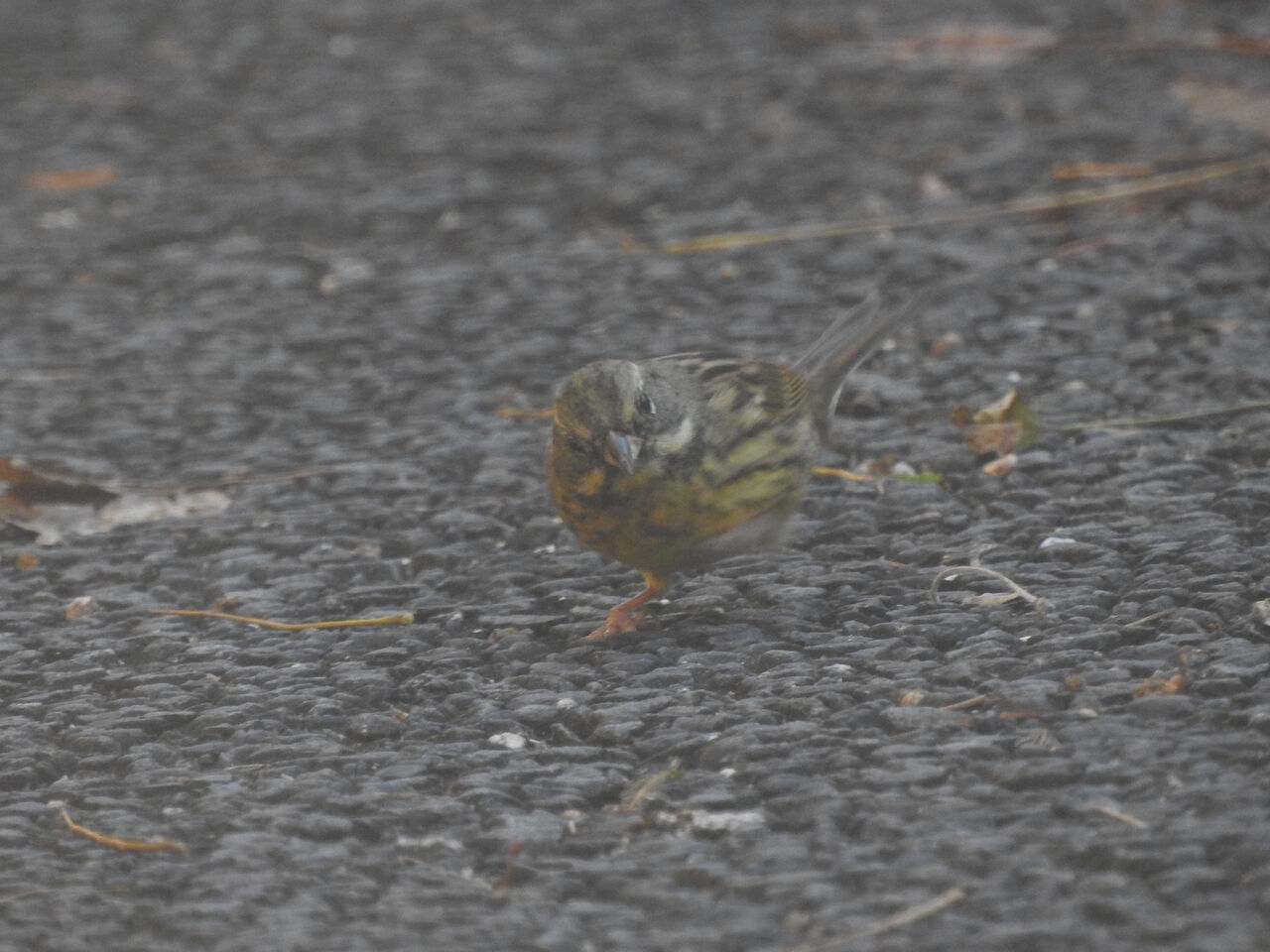 どん曇りのアスファルト舗装道路に出てきたアオジを上手く撮られましたね。