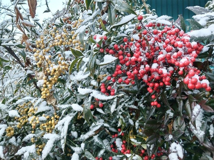 雪が積もった紅白の南天綺麗ですね。