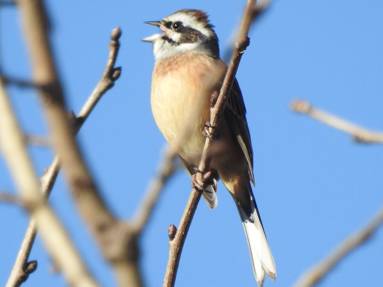 青空をバックにホオジロ♂が盛んに囀っていますね。