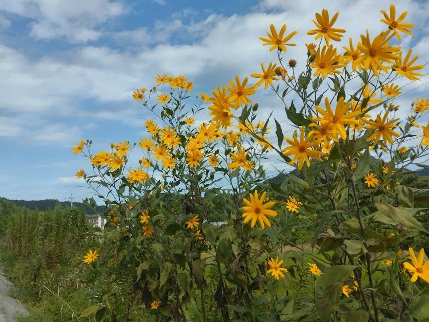 2025年09月19日 水車のある道の駅9/19 今日は一気に涼しくなり 空も秋空になりましたお昼にソバ食べたくなり道の駅「伊王野」に行ってきました残念ならそば屋さんは定休日で 隣ん店でうどんを物産センターなど見ながら 秋の数時間を楽しんできました出かける前に散策兼運動へ キクイモが秋の空に本来ならこの水車でソバを食べるはずが何年も前に水車作りに凝ってるころ この水車も参考にしました止まってるように見えるけど 二台とも力ずよく回ってます物産館に在ったホテイソウの花 350円だったかな水車の骨組み これなども参考になりましたよ正面からの映像 大きいでしょうわきの小屋でソバの実を引いてます 今日も作業してましたやはり秋は気持ちいいですねnorisuke